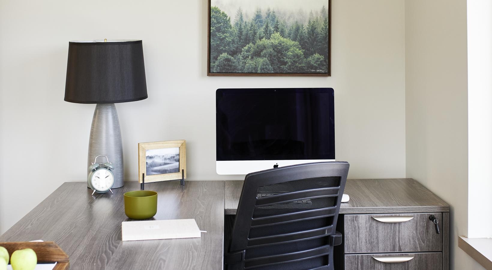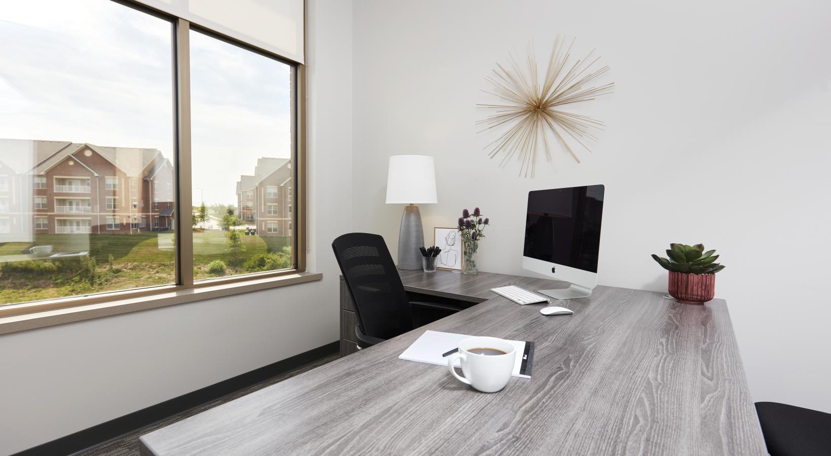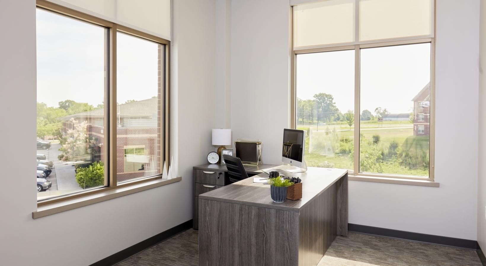• a room with a desk and windows