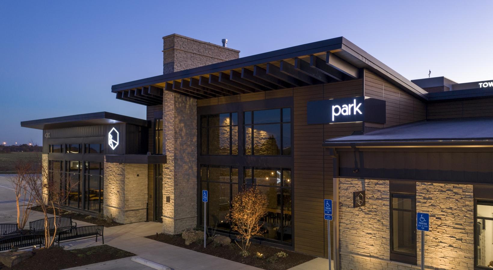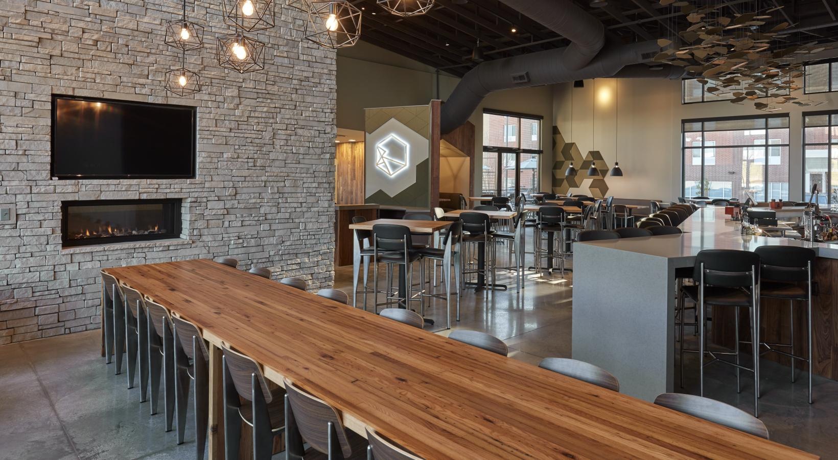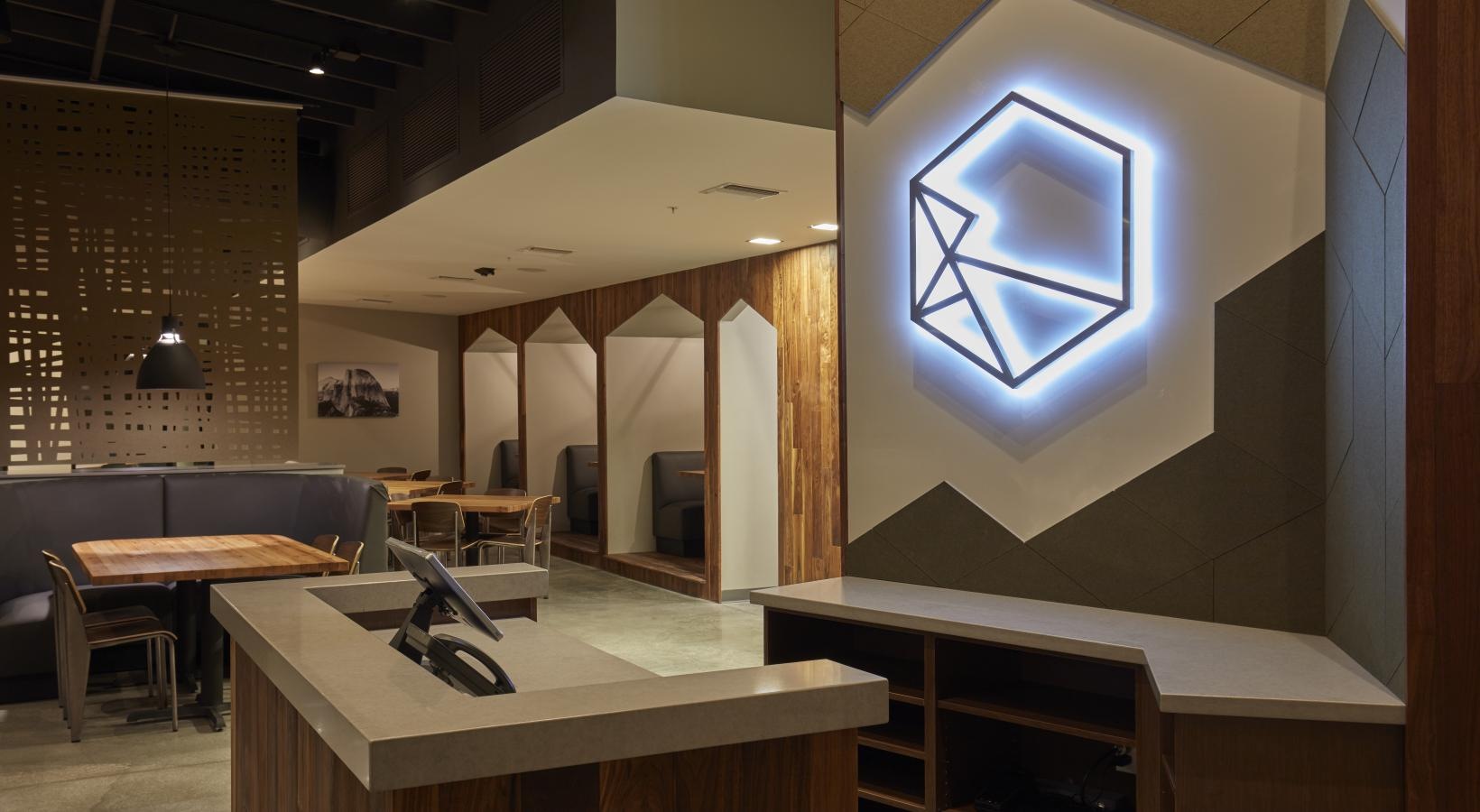 • a building with a large sign and seating area with fire pit