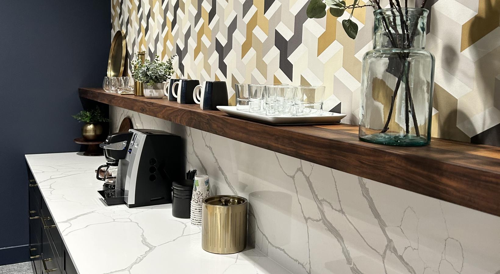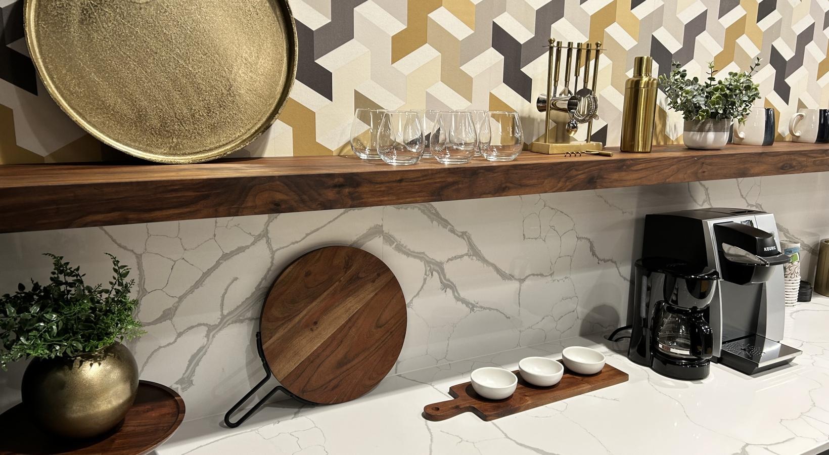 • a kitchen counter with a coffee machine and glasses and a wood spoon
