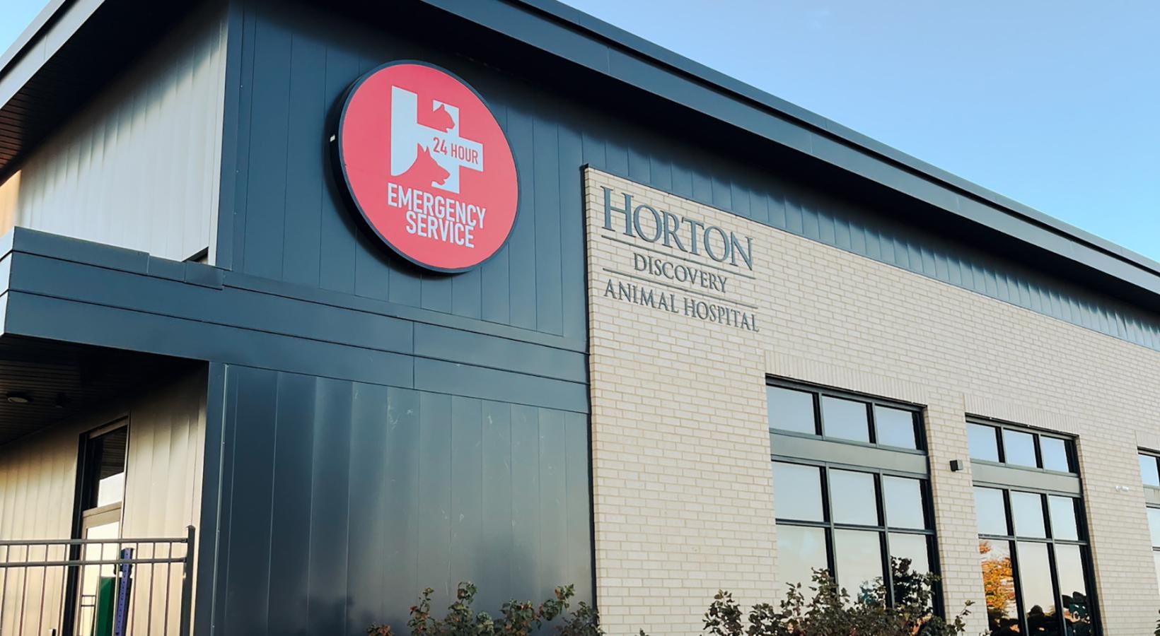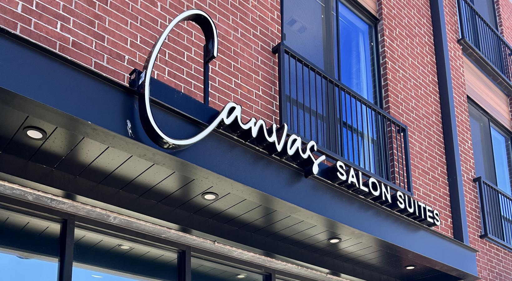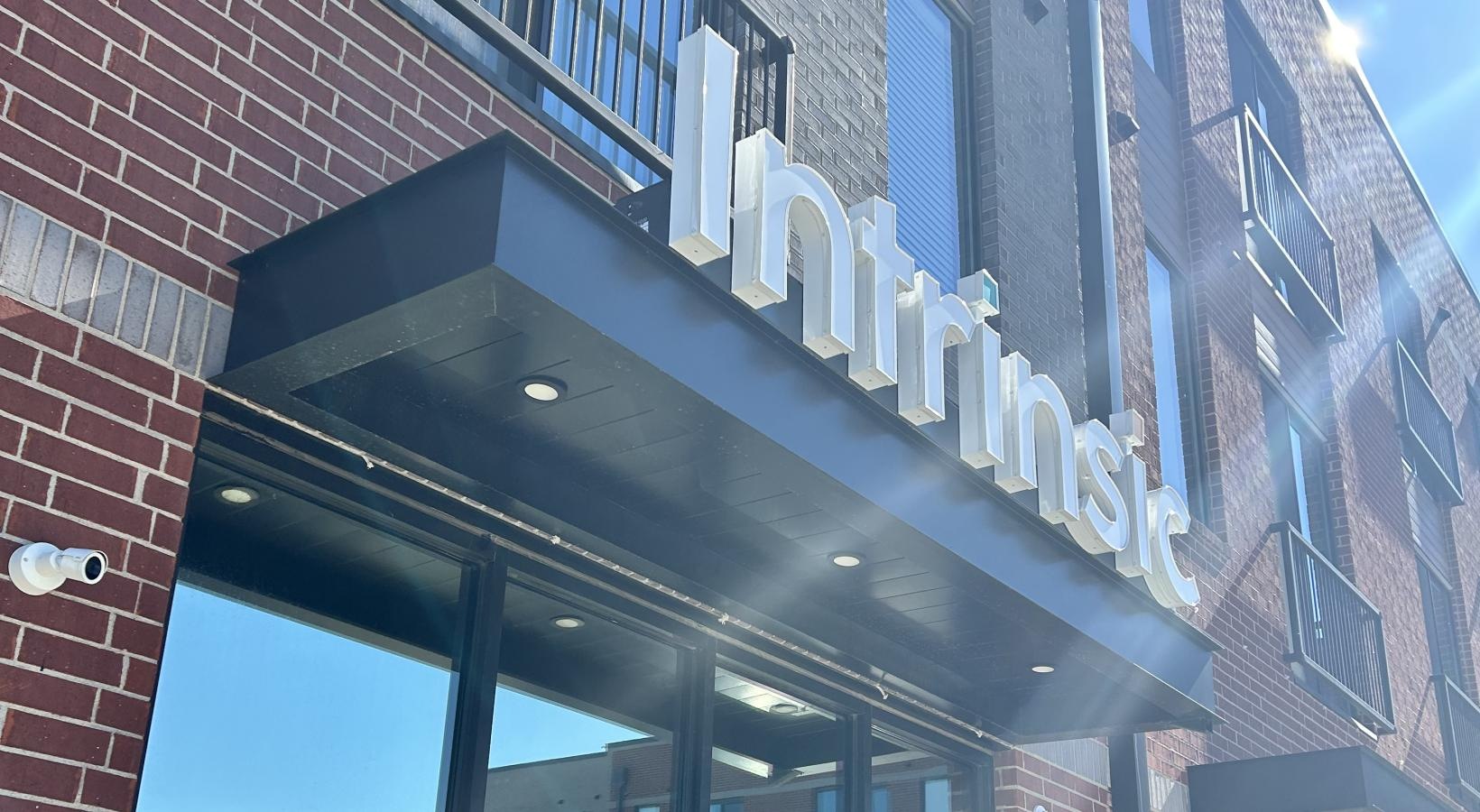 • a building with a sign and windows
