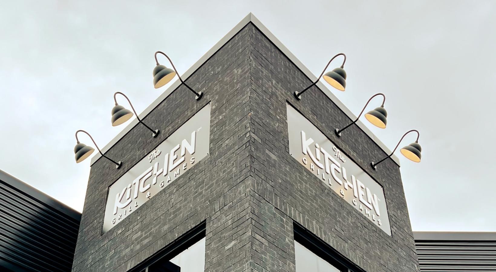 • a brick building with signs and lights on it