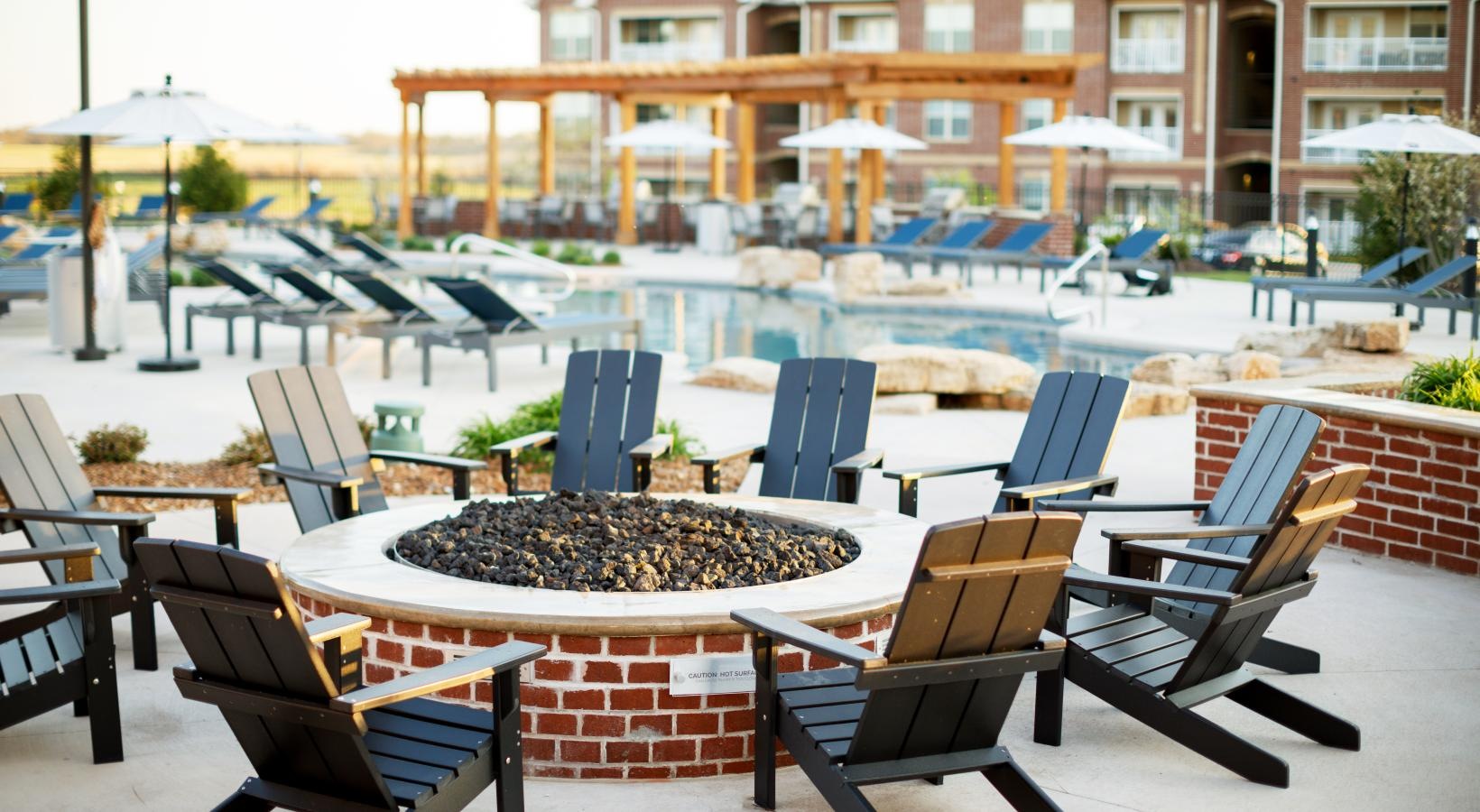 • a patio with chairs and a fire pit