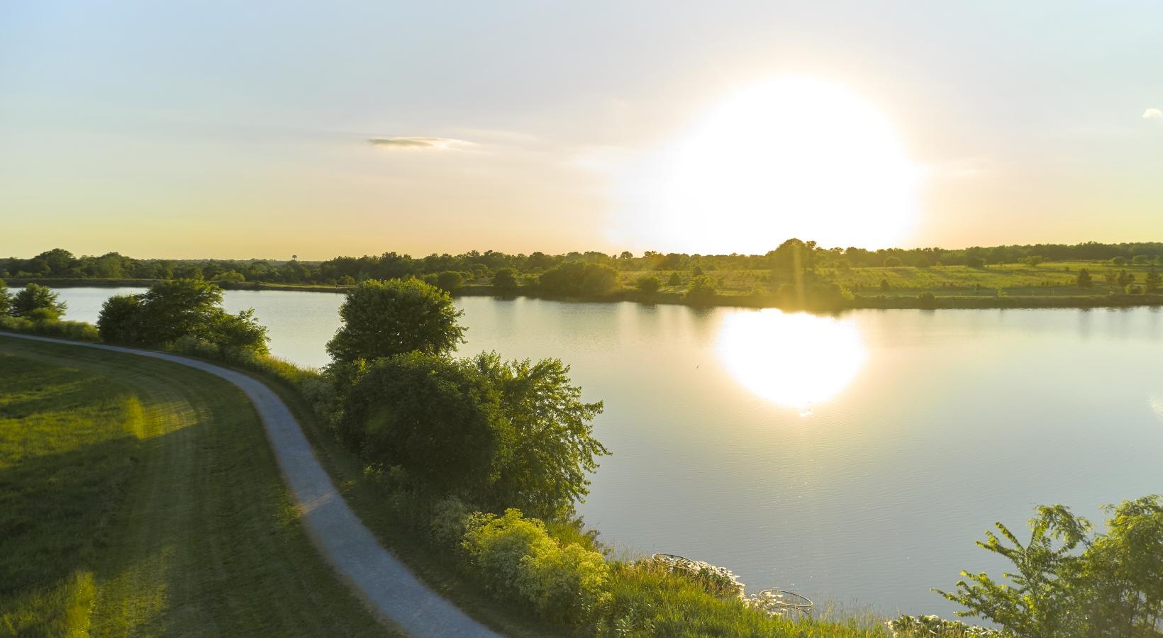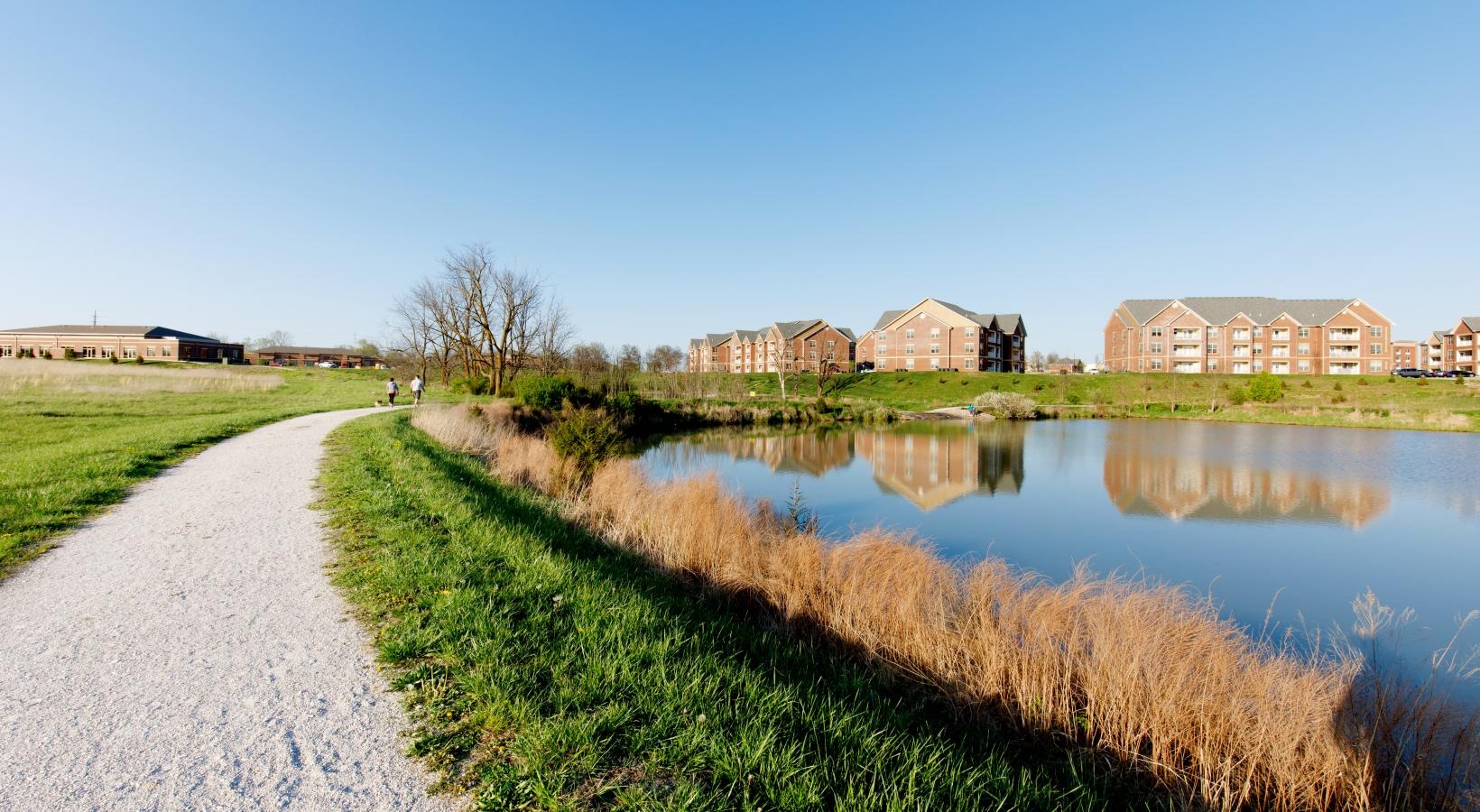 • a path next to a body of water with buildings in the background