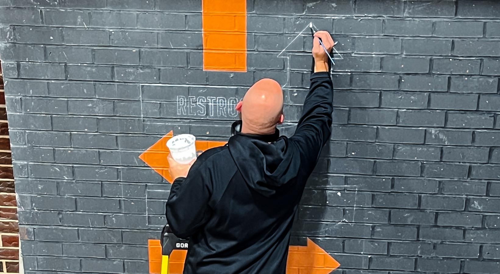 • a man drawing signs on a black brick wall