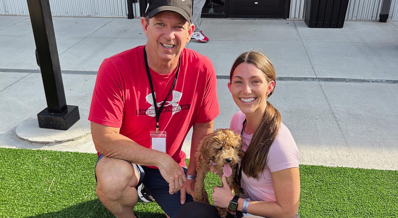 • a man and woman sitting on grass with a dog