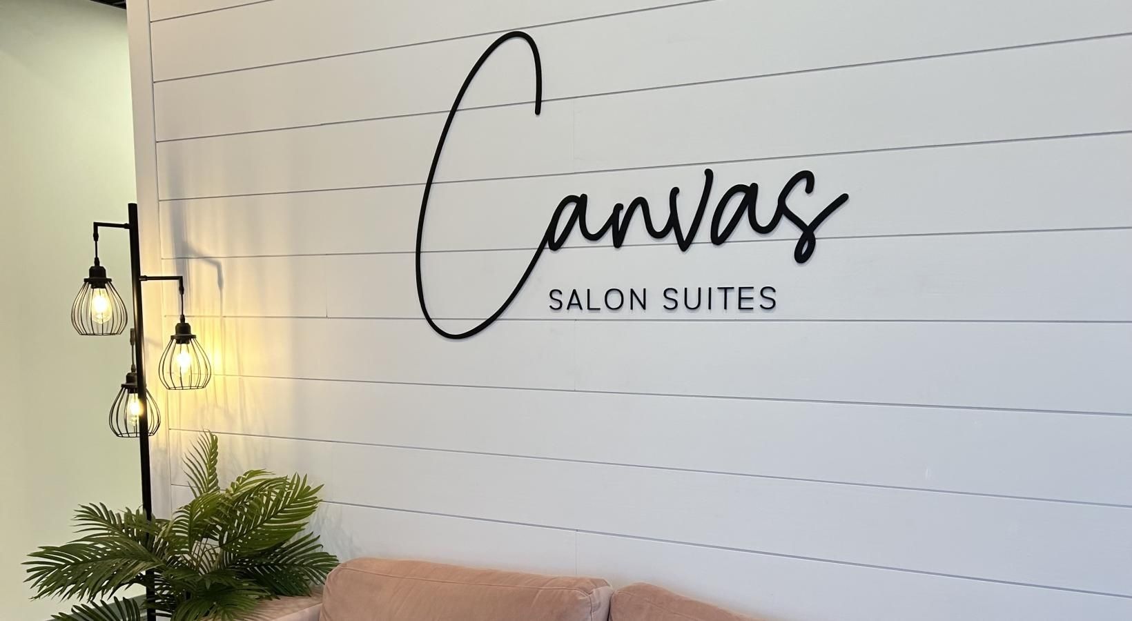 a couch in front of a wood wall with a sign on it next to a plant