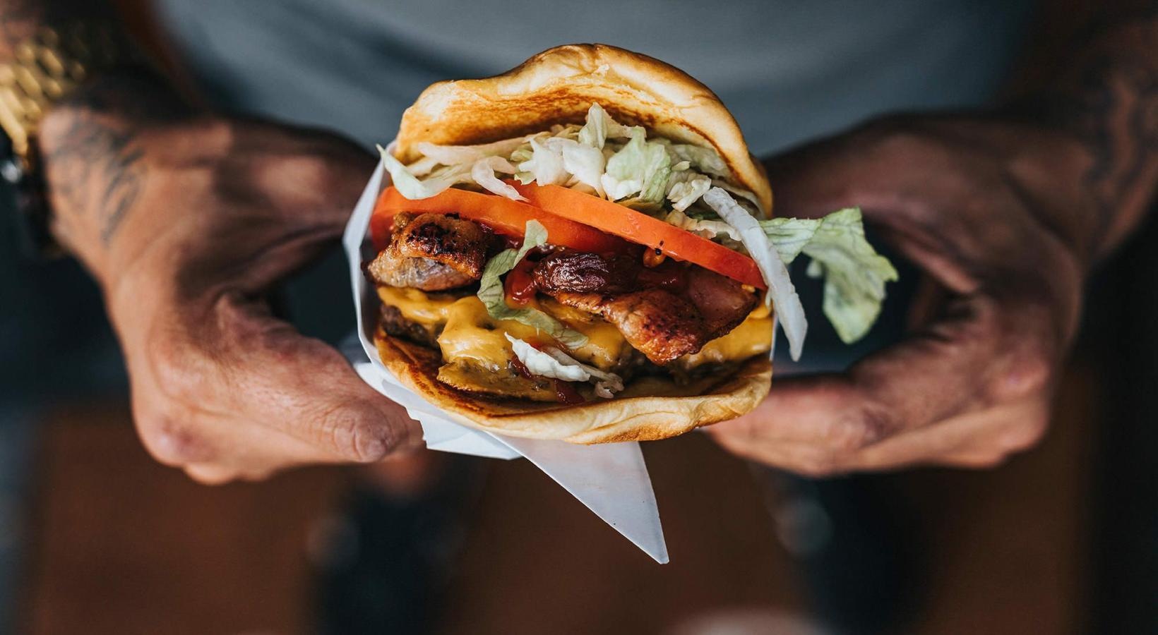 • man holds a thick, juicy burger with both hands
