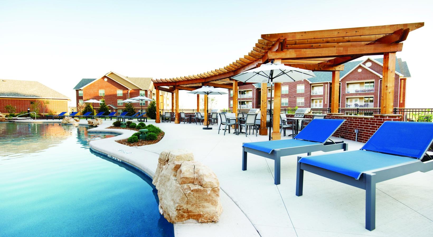 • a swimming pool with a lounge chair and umbrellas by it