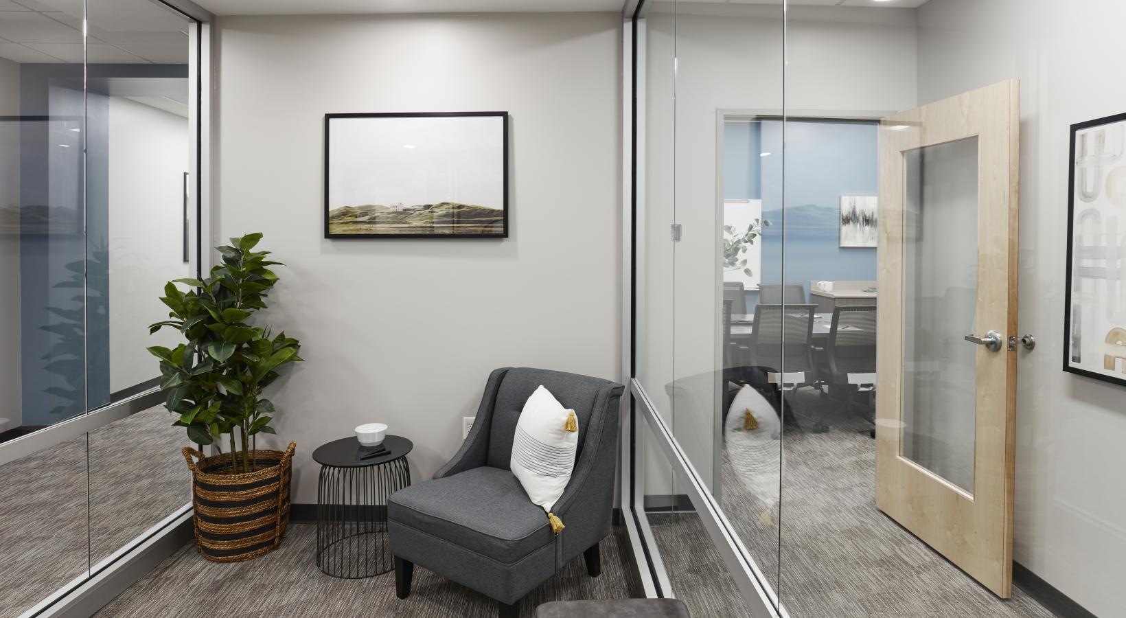 • a conference room with a table and chairs