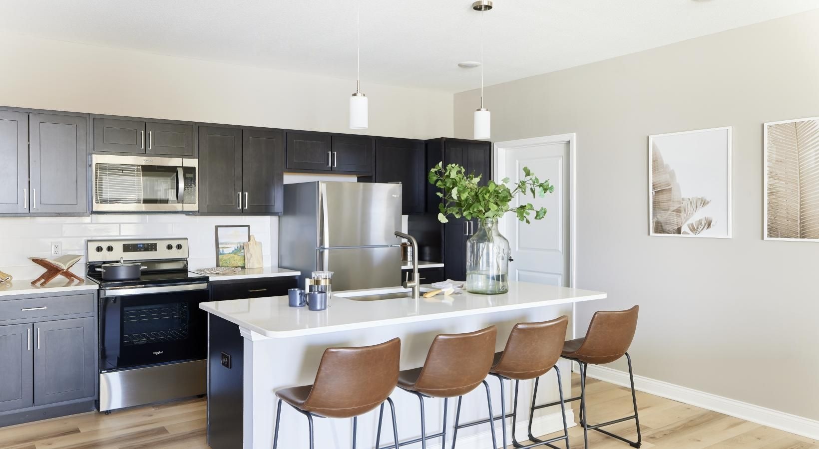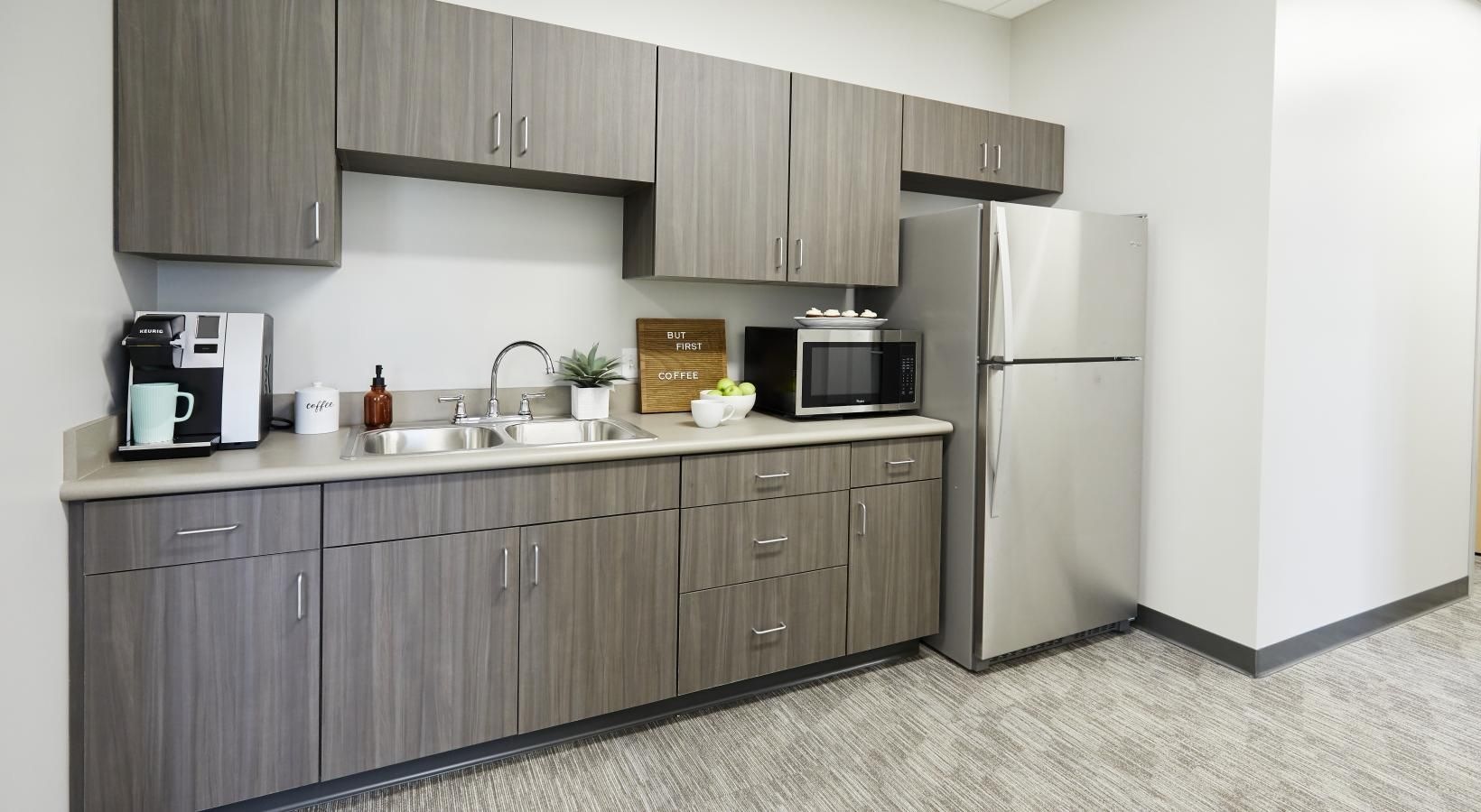 • a kitchen with a fridge and microwave