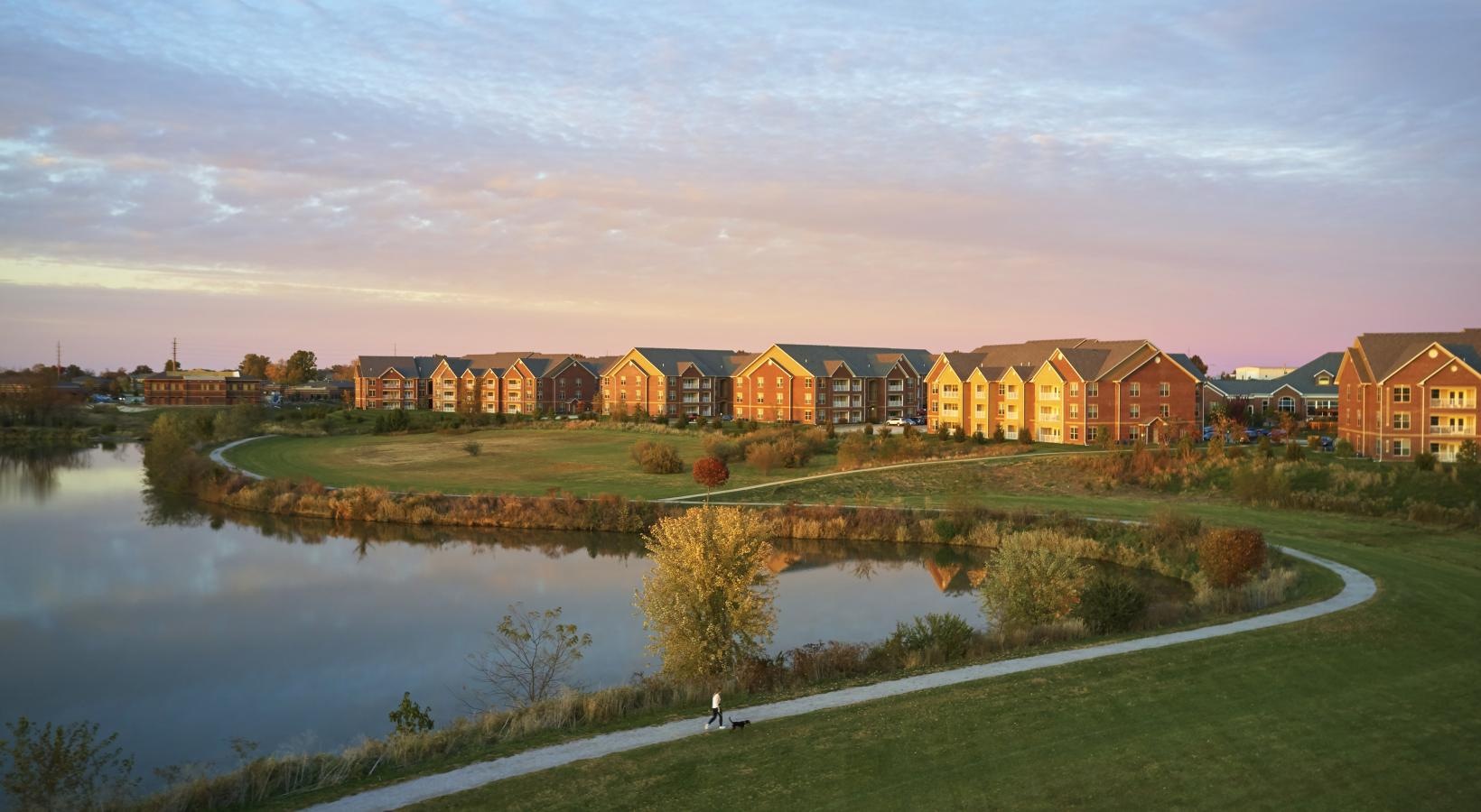 • a body of water with buildings along it