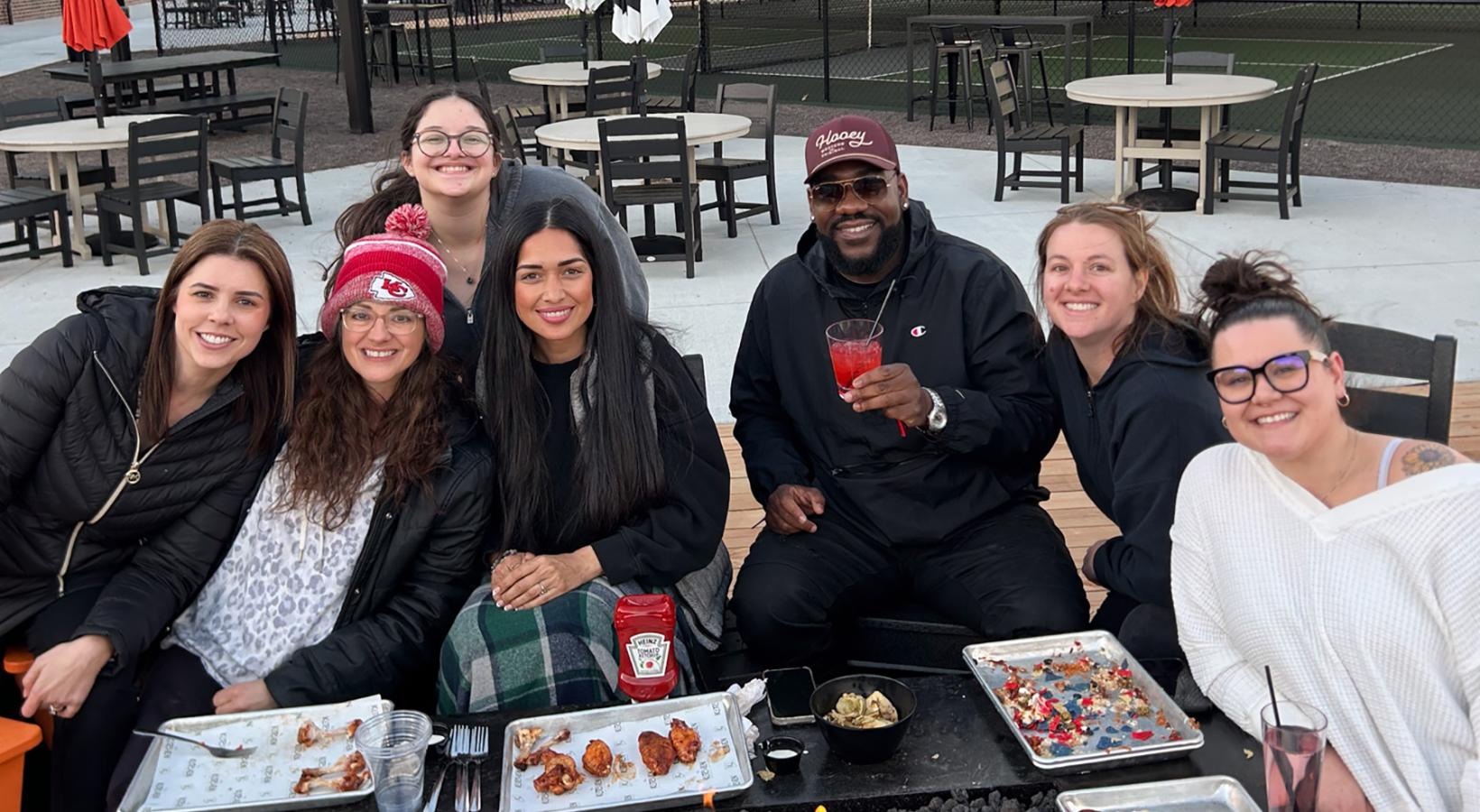 • an outdoor patio with seating and people talking