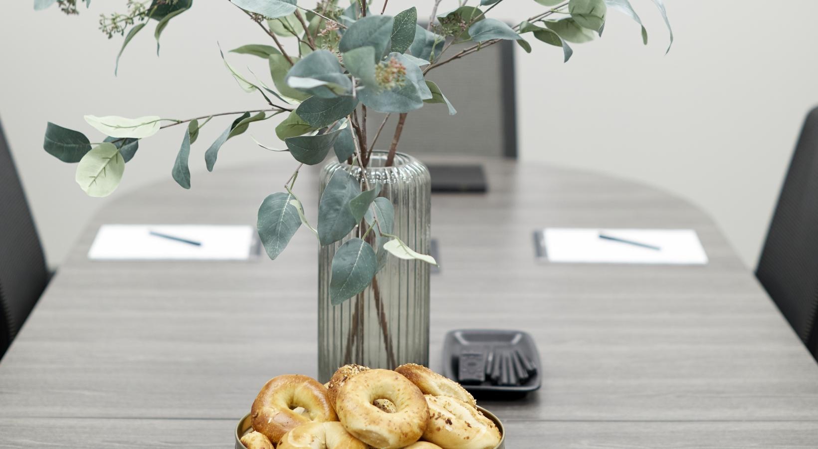 • a conference table with a bowl of bagels next to a plant