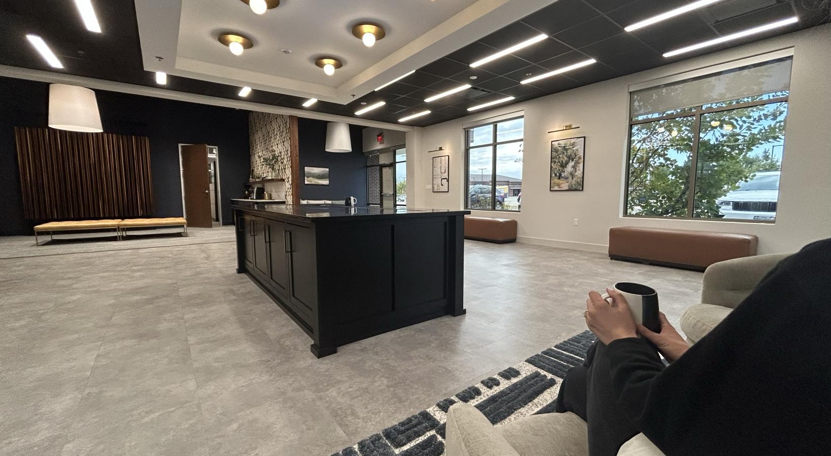 • a room with tables and a reception desk