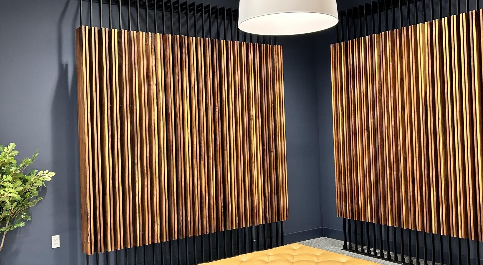 • a wood wall with a plant and a chair in front of it
