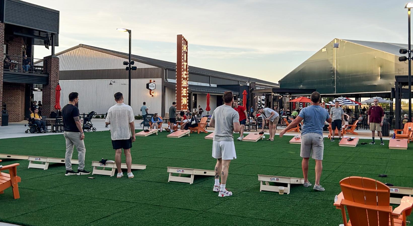 • a group of people standing on a grass area playing corn hole