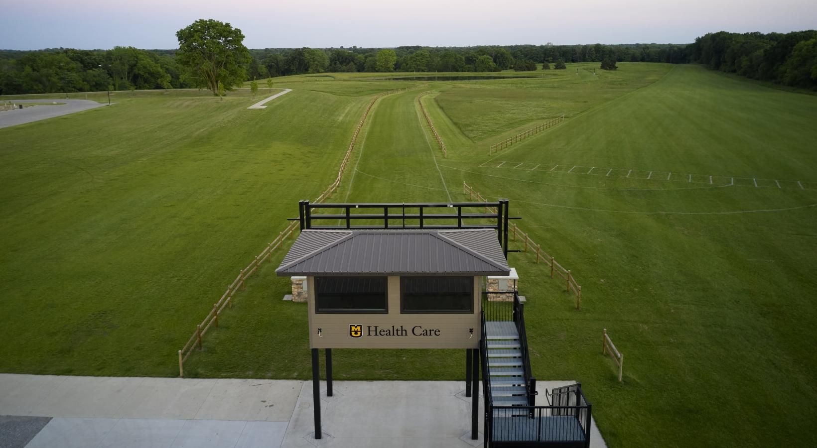 • a building next to a green field