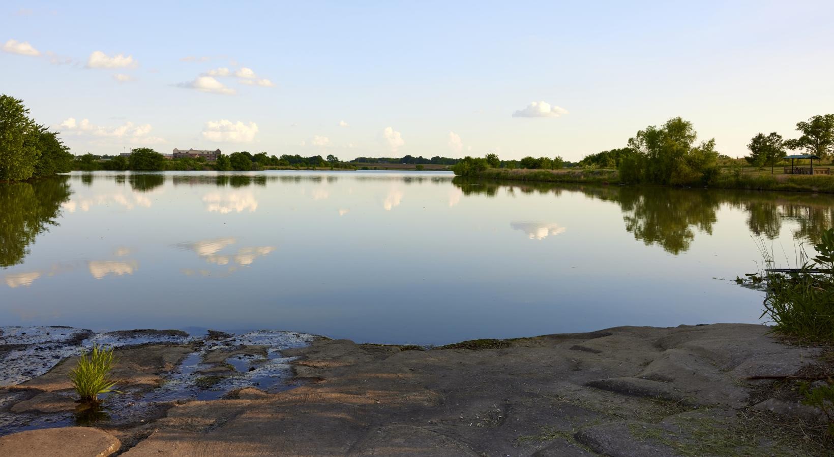 • a body of water with trees and a blue sky