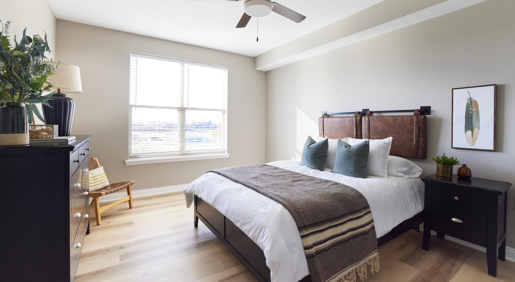 • a bedroom with a bed and a fan
