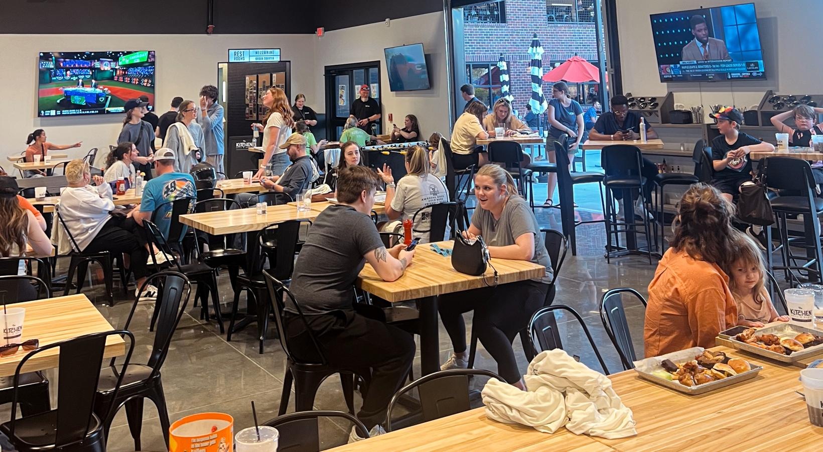 • a group of people sitting at tables in a room with tvs